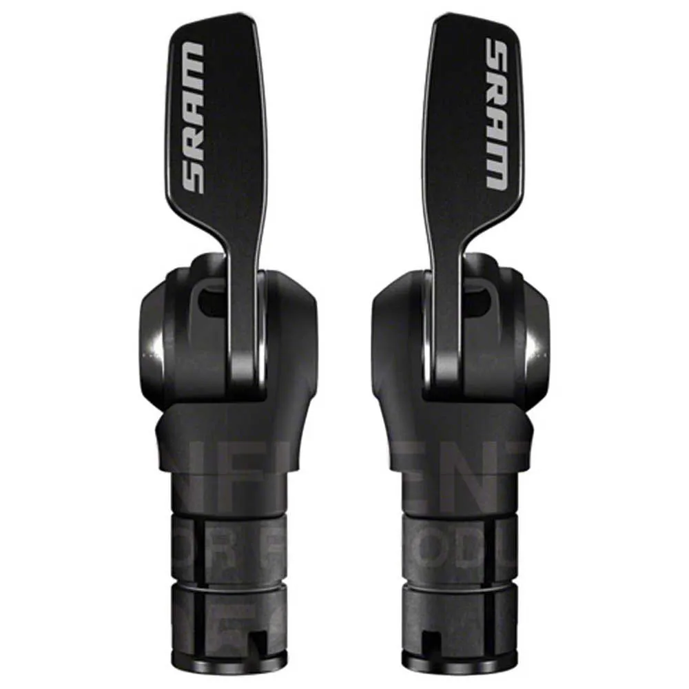 11-/2 velocidades, set SRAM Bar End Shifter ´´Aero 500´´ para manillar de triatlón y contrarreloj, maneta y cuerpo de aluminio, compatible con todos los grupos de carretera SRAM, mando izquierdo con 3 posiciones para ajuste fino, 154g/par.